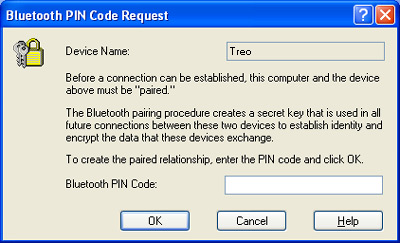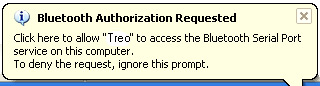 ![]() ![]() ![]() Step4: On Windows, the Bluetooth icon in the tray area should change color to indicate the Bluetooth connection request from your Treo is received. You should also see a or more Balloon window showing up from the tray icon, depending on your Bluetooth notification settings and whether you are using secure connection. 1. If the Balloon window says "Bluetooth PIN Code Required", click on it to bring up the PIN dialog. For convenience, just leave the PIN code empty and select OK. Then on your Treo side you should also see the PIN dialog, do the same thing. 2. If the Balloon window says "Bluetooth Authorization Requested", click on it to bring up the authorization dialog and select "OK".